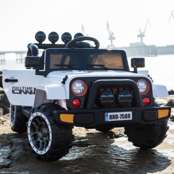 AUTO MEGA JEEP FULLTIME Z NAPĘDEM 4X4z systemem ESW - system wolnego startu, hamulcem oraz z kołami EVA i miękkim siedzeniem zasilane na 12 V z napędem na cztery koła zachwyci nie jednego przyszłego kierowcę. Dzięki zastosowanym najmocniejszym silnikom 45 W, auto jeździ po nierównym terenie bez żadnych problemów - posiada olbrzymie miękkie koła EVA, Najciekawszą funkcją pojazdu jest SYSTEM WOLNEGO STARTU, oraz SYSTEM HAMOWANIA Z PILOTA Z FUNKCJĄ BLOKADY JAZDY MANUALNEJ