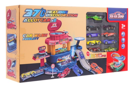 Niesamowita, interaktywna myjnia na wodę z zestawem ośmiu pojazdów zmieniających kolor pod wpływem wody to zabawka dla małych miłośników motoryzacji od 3- go roku życia. Zabawka posiada 3 poziomy. Pierwszy i drugi poziom, na których umiejscowiona jest myjnia, połączony jest ruchomą windą na korbkę. Na dole znajduje się także panel dźwiękowy z różnymi odgłosami syren i migającym światełkiem LED. Na górze jest lotnisko dla helikoptera oraz zbiornik na wodę. Po uzupełnieniu zbiornika wodą kręcimy korbką, a woda przedostaje się, na niższe poziomy „myjąc samochody". Samochody pod wpływem wody zmieniają kolor. Do zestawu dołączono aż osiem autek i jeden helikopter. Zabawka zasilana jest bateriami typu 3 x AG, które znajdują się w zestawie.