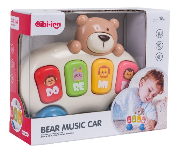 Pianinko z misiem i kółeczkami dla dzieci od osiemnastego miesiąca życia. Pianinko wykonano z najlepszej jakości materiałów w żywych kolorach, nie posiada ostrych zakończeń. Pianinko przypomina samochodzik z misiem i posiada cztery klawisze dźwiękowe z rysunkami zwierzątek i podświetleniem. Naciśnięcie na klawisz spowoduje uruchomienie trybu pianina (odgłosy nut, podświetlenie klawisza). Podwójne naciśnięcie na ten sam klawisz spowoduje uruchomienie odgłosów zwierzątka. Naciśnięcie na misia u góry uruchamia wesołe melodie. Zabawka zasilana jest bateriami typu 2 x AAA 1,5V.