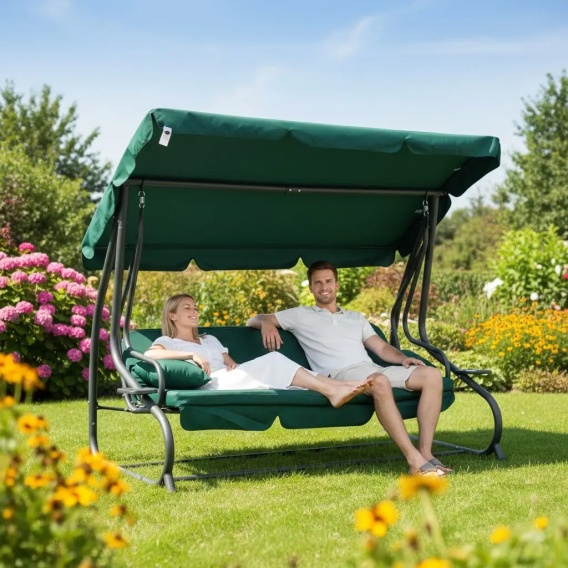 Rodzinna Huśtawka ogrodowa z Daszkiem Zielony + Tekstylina 2x1 + Regulowane siedzisko + Materac + 2 Podstawki na napoje