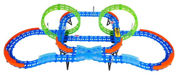 Fluorescencyjny tor wyścigowy z ostrymi zakrętami, pętlami i szybkim autkiem to propozycja dla dzieci od trzeciego roku życia. Zestaw składa się z 63 elementów do samodzielnego montażu. Na torze znajdują się odcinki proste, ostre zakręty z barierkami zabezpieczającymi przed wypadaniem pojazdu z trasy, a także dwie pętle 360 stopni. Pętle są fluorescencyjne, świecą w ciemności. Autko również posiada oświetlenie w tylnej części. Autko zasilane jest bateriami typu 2 x AAA 1,5 V, baterii brak w zestawie.