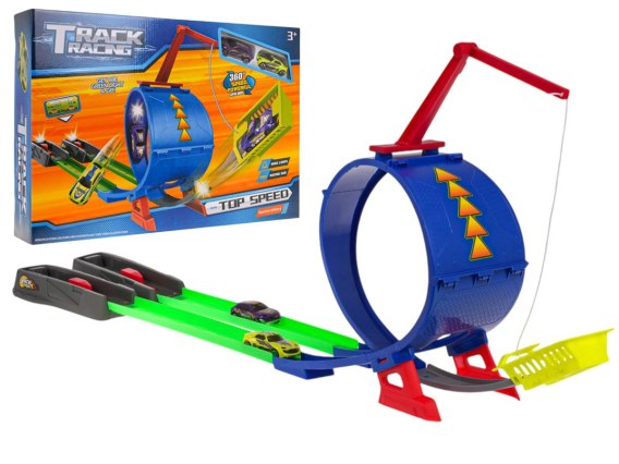 Tor wyścigowy z wyrzutnią dla dzieci od 3-go roku życia. Tor wykonano z najlepszej jakości plastiku w żywych kolorach. Tor posiada wyrzutnię, odcinki proste do rozpędzenia pojazdu, pętlę 360 stopni i dwa pojazdy.